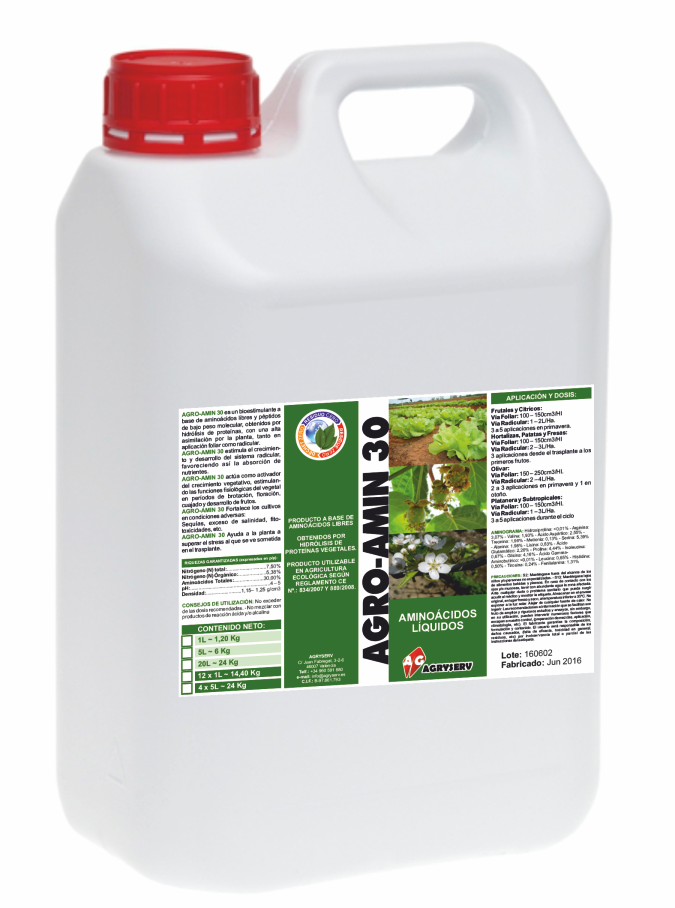 AGRO-AMIN 30 es un bioestimulante a base de aminoácidos libres y péptidos de bajo peso molecular, obtenidos por hidrólisis de proteínas, con una alta asimilación por la planta, tanto en aplicación foliar como radicular. Esta combinacion ayuda a las plantas a superar situaciones de stress tanto del transplante como de condiciones adversas como Sequías, salinidad, etc...