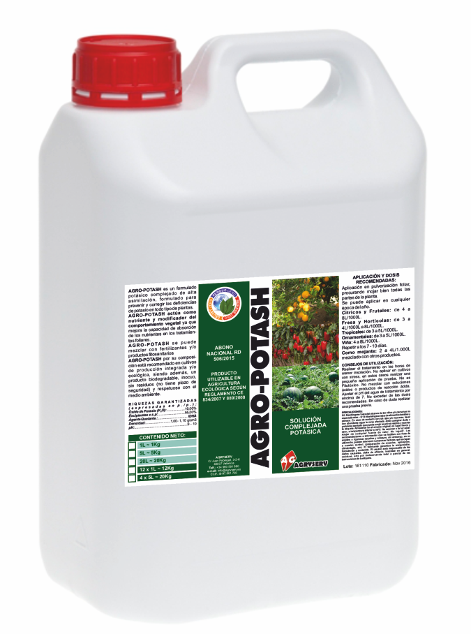 AGRO-POTASH es una Solución Potásica líquida que actua como fuente de Potásio. Actúa como nutriente y modificador del comportamiento vegetal ya que mejora la capacidad de absorción de los nutrientes en los tratamientos foliares y fortalece la planta frente agentes abióticos.