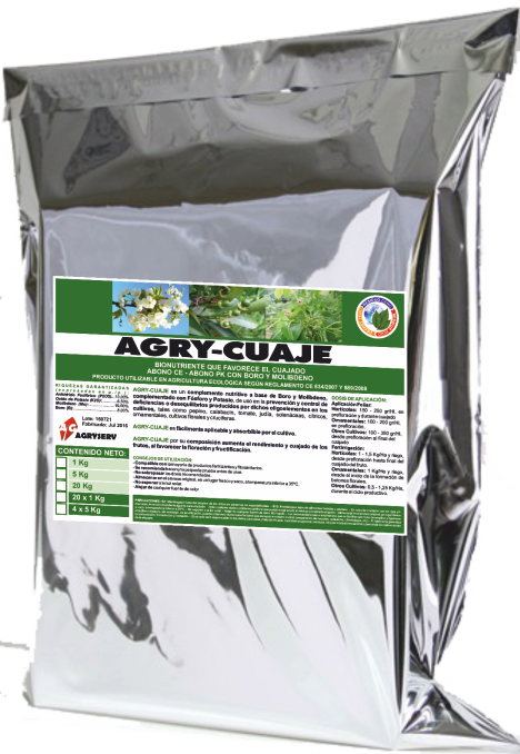 AGRY-CUAJE es un complemento nutritivo a base de Boro y Molibdeno, complementado con Fósforo y Potasio, de uso en la prevención y control de deficiencias o desequilibrios producidos por dichos oligoelementos en los cultivos, tales como pepino, calabacín, tomate, judía, solanáceas, cítricos, ornamentales, cultivos florales y crucíferas.