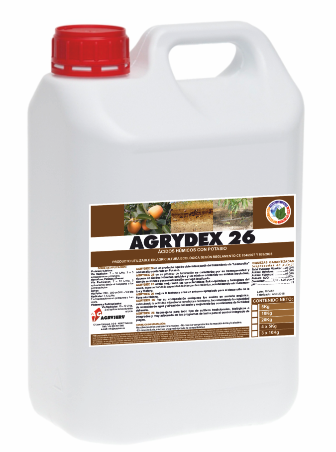 AGRYDEX 26 es un producto líquido obtenido a partir del tratamiento de "Leonardita" con un alto contenido en Potasio. En su proceso de fabricación se caracteriza por su homogeneidad y riqueza en Ácidos Húmicos solubles y un mínimo contenido en sólidos insolubles, siendo así idóneo para su utilización en riego localizado.