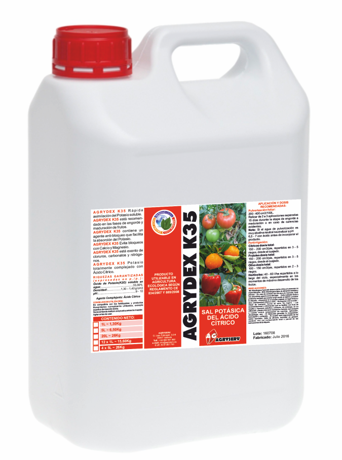 AGRYDEX K25 es un producto líquido indicado para la corrección de carencias de Potasio, tanto por vía foliar como radicular. El producto esta indicado para su uso en las etapas de engorde y maduración de los frutos. Además presenta una rápida asimilación del Potasio soluble y presenta agente anti-bloqueo de este elemento, de Calcio y de Magnesio
