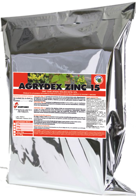 AGRYDEX ZINC 15 es un producto sólido a base de quelato de Zinc, indicado para la prevención y corrección de los síntomas producidos por deficiencias de este elemento tanto en suelos ácidos como básicos, que se manifiesta con un coloramiento amarillo-blanquecino alrededor de los nervios secundarios. Se puede aplicar de forma directa al suelo o en pulverización foliar.