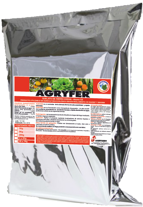 AGRYFER es un corrector de la clorosis férrica de alta estabilidad y rápida actividad. Por su formulación como microgránulo dispersable y la alta solubilidad confieren al producto un excelente manejo y rápida disolución en agua, pudiéndose utilizar por fertirrigación, inyección o directamente al suelo.
