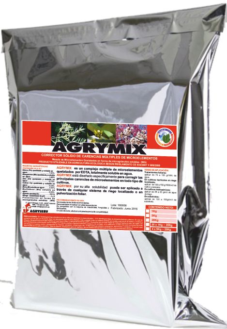 AGRYMIX es un complejo múltiple de microelementos quelatados por EDTA, totalmente soluble en agua y diseñado específicamente para corregir las principales carencias de microelementos en todo tipo de cultivos. Presenta una alta solubilidad y se presenta como microgranulo dispersable (WG).