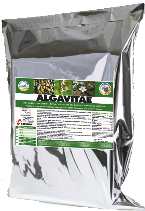 ALGAVITAE es un bioestimulante natural a base de extractos marinos procedentes del Atlántico Norte, que además contiene más de 60 nutrientes, hidratos de carbono, aminoácidos y promotores de crecimiento de origen vegetal, libres de impurezas y de metales pesados.