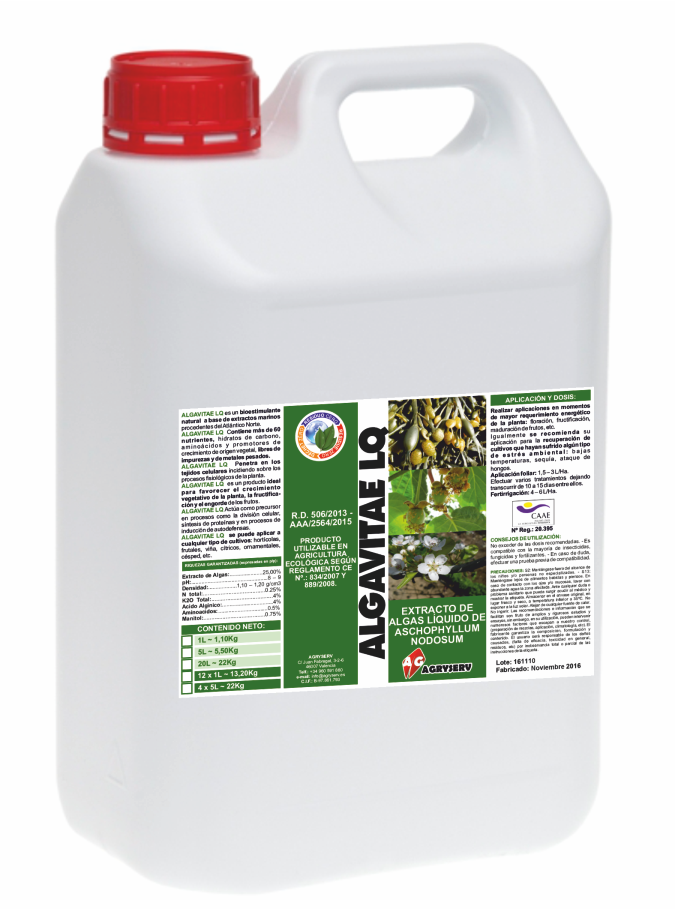 ALGAVITAE LQ es un bioestimulante natural a base de extractos marinos procedentes del Atlántico Norte, que además contiene más de 60 nutrientes, hidratos de carbono, aminoácidos y promotores de crecimiento de origen vegetal, libres de impurezas y de metales pesados.
