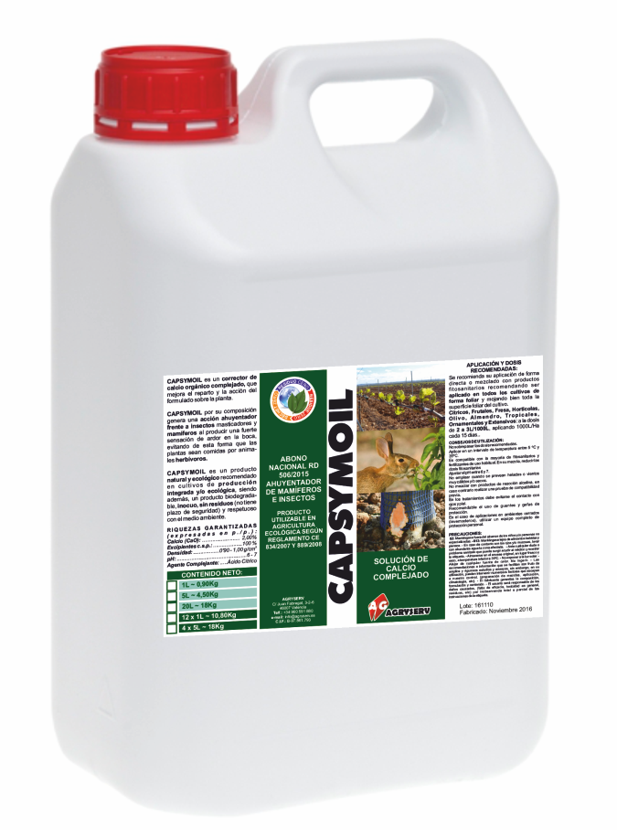 CAPSYMOIL es una solución complejada de Calcio orgánico con componentes activos vegetales que nutren la planta, a la vez que inducen la formación de las defensas naturales en las plantas para prepararlas frente a agentes abióticos.