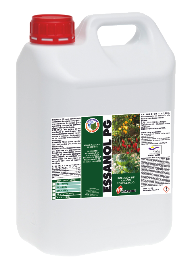 ESSANOL PG es un producto para protección de la planta a base de calcio complejado y otros componentes vegetales que nutren la planta, a la vez que inducen la formación de las defensas naturales en las plantas para prepararlas frente a agentes abióticos.