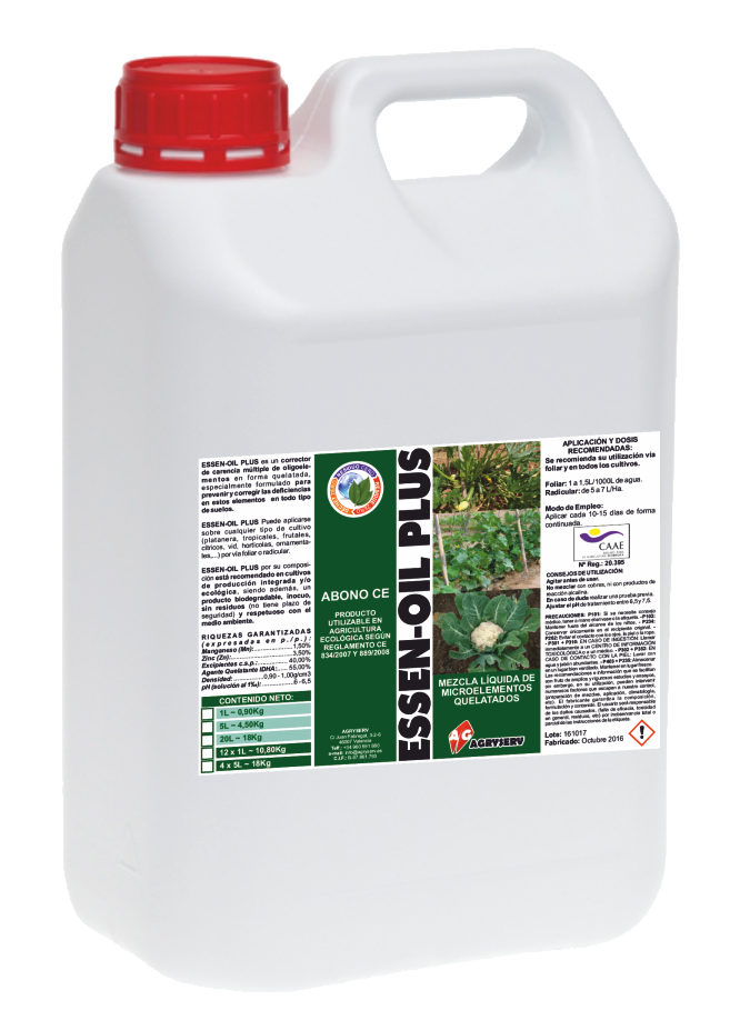 ESSEN-OIL PLUS es un producto natural para protección de la planta a base de Zinc y Manganeso quelatados y otros componentes vegetales que nutren la planta, a la vez que inducen la formación de las defensas naturales en las plantas para prepararlas frente a agentes abióticos.