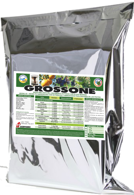 GROSSONE es un fertilizante orgánico equilibrado que acelera el crecimiento de la planta, aumenta su rendimiento y mejora la calidad y tamaño del producto final. Aumenta además la concentración de Citoquinina en la planta, mejorando la eficencia del uso del Nitrógeno, lo cual aumenta la síntesis de aminoácidos y proteínas.