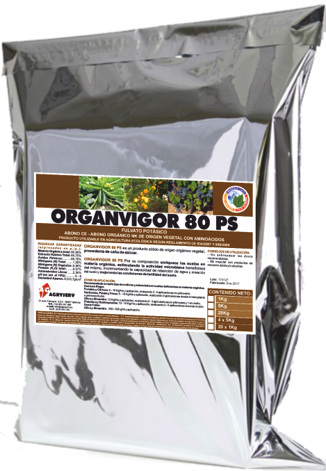 ORGANVIGOR 80 PS es un abono a base de Nitrógeno y Potasio, que combina en su aplicación al suelo, las excelentes propiedades de los ácidos fúlvicos y aminoácidos que actúan como base orgánica y reguladora del humus, mejorando la asimilación por parte del cultivo.