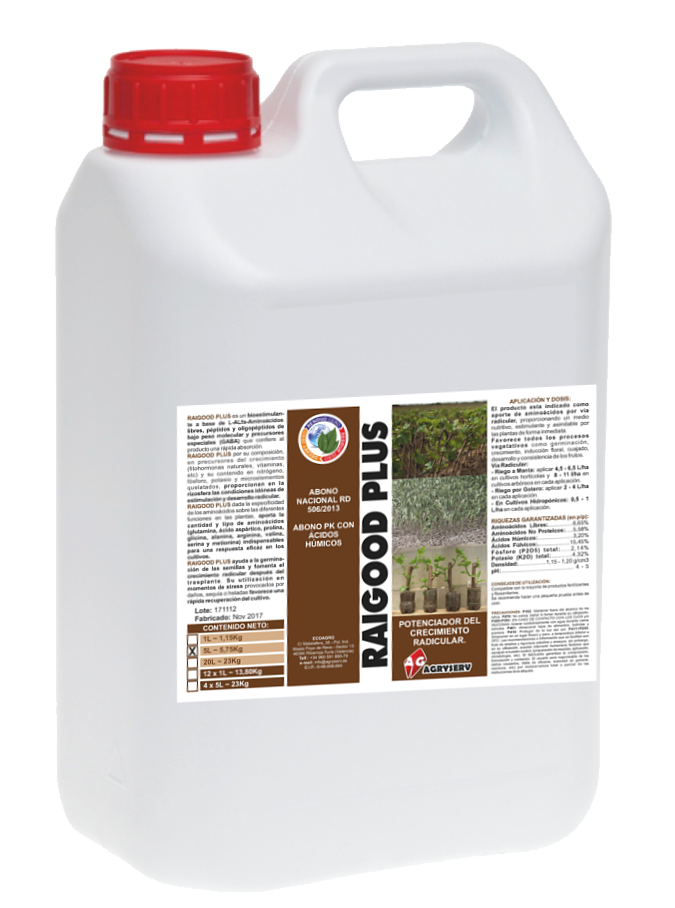 RAIGOOD PLUS es un bioestimulante a base de L-ALfa-Aminoácidos libres, péptidos y oligopéptidos de bajo peso molecular que confiere al producto una rápida absorción. Presenta precursores del crecimiento (GABA), PK y extractos húmicos, proporcionando en la rizosfera las condiciones idóneas de estimulación, germinación y desarrollo radicular.