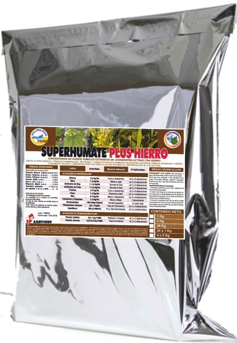 SUPERHUMATE PLUS HIERRO es un producto sólido obtenido a partir del tratamiento de "Leonardita" con un alto contenido en Potasio y Hierro. Presenta una alta riqueza en Ácidos Húmicos solubles y un mínimo contenido en sólidos insolubles, siendo así idóneo para su utilización en riego localizado.