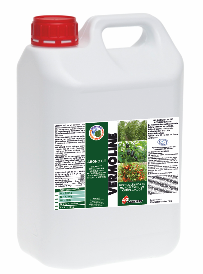 VERMOLINE es un formulado especial líquido a base de Zinc y Manganeso en forma complejada, formulado a base de aceite acuoso con extractos vegetales, que nutren la planta actuando como corrector de deficiencias de zinc y manganeso