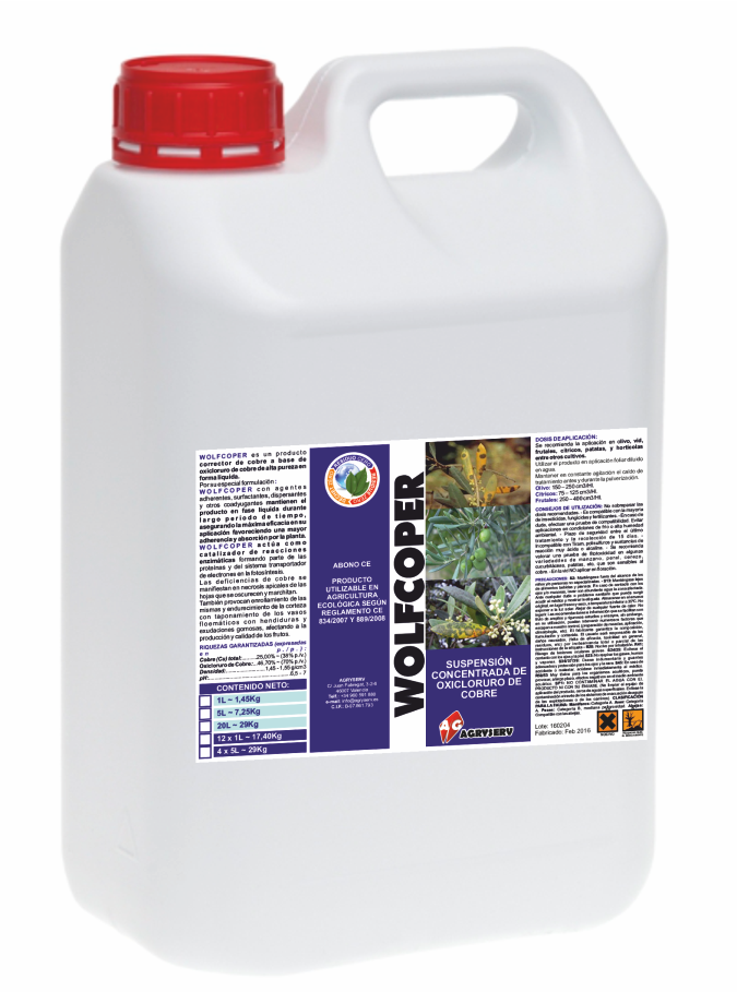 WOLFCOPER es un producto a base de oxicloruro de Cobre de alta pureza (70% en p/v) en forma líquida, indicado para el control preventivo y curativo de estados carenciales de Cobre. Por su efecto corrector, previene las necrosis apicales de las hojas que se oscurecen y marchitan, devidas a la deficiencia de este elemento.